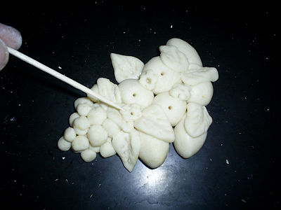 Делаем из теста виноград, яблочки, сливки, цветочки и листочки. Все это соединяем вот в такую гроздь. Для декорирования воспользуемся стеками или зубочисткой.