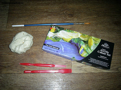 Для того чтобы сделать сувениры и поделки из соленого теста, нам понадобятся такие материалы, как соленое тесто, акриловые краски, кисточка, клеящий термопистолет, стеки. Соленое тесто сделаем из муки, соли и воды. Смешаем их в пропорции 3:2:1. Можно добавить тесто немного клея ПВА. Замешиваем тесто. Оно должно получиться упругим. Если будет липнуть к рукам – добавьте еще муки, если будет крошиться – воды. Хорошо вымешиваем тесто и кладем его в холодильник на пару часов. Это сделает его более удобным в работе.