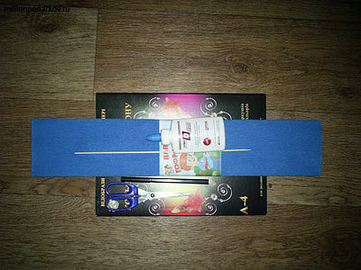 Для изготовления поделки методом торцевания приготовьте гофрированную бумагу, цветной картон, клей ПВА, бамбуковую шампура, ножницы и простой карандаш.