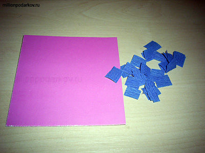 Таким же образом сделаем еще одну картинку в виде цветочка. Для этого нам понадобится картонный квадрат розового цвета, квадратики из синей гофрированной бумаги.