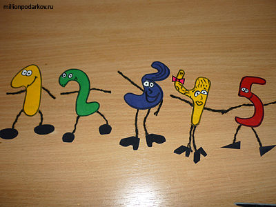 Из ниток для вязания делаем руки и ноги, приклеив нитки к обратной стороне цифр. Вырезаем из бумаги башмачки и одеваем их на ноги каждой цифре. Цифры из бумаги получились весёлые и ими можно играть.