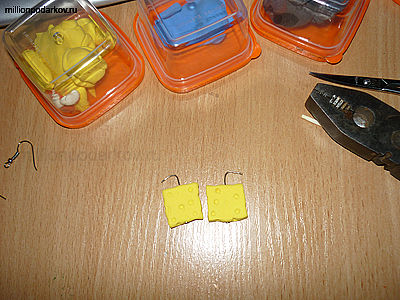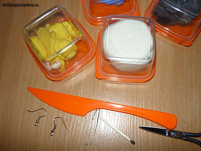 Для поделки "Детские серьги" вам потребуется масса для лепки, которая застывает на воздухе. Так же вам потребуются швензы, гвоздики, ножницы, плоскогубцы, пластмассовый нож, акриловая краска, которой мы будем рисовать мордочку, спичка.