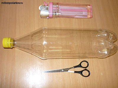 Для того, чтобы у нас получилась ваза из пластиковой бутылки, нам потребуются помимо бутылки, ножницы и зажигалка.