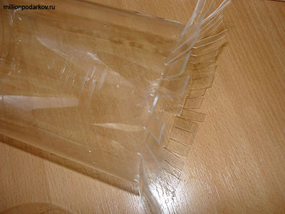 Оформим срез бутылки. Для этого делаем надрезы толщиной 5-7мм и длинной 2-3 см от края бутылки. Затем, чтобы пластиковая бахрома не кололась, мы опаляем её с помощью зажигалки.