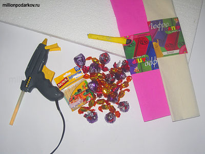 Для изготовления поделки приготовьте пенопласт толщиной не меньше 3 см, поскольку конфеты будут крепиться на зубочистках и лучше, чтобы они на выглядывали с обратной стороны. Так же подготовьте гофрированную бумагу сочетающихся между собой цветов.