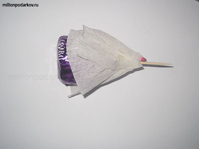 В конфету со стороны фантика воткните зубочистку и оберните несколько раз полосой бумаги, немного сморщив бумагу. Закрепите скотчем. расправьте бумагу. Таким же образом сделайте дополнительные декоративные элементы. Но зубочистке я сложила сразу полоску розовой бумаги, потом белой. Расправьте бумагу.