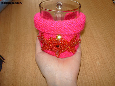 Завязываем кофточку на кружке. Приклеиваем элементы декора. Вот так за один вечер можно изготовить вязаные украшения поделки "Кофта для кружки"!