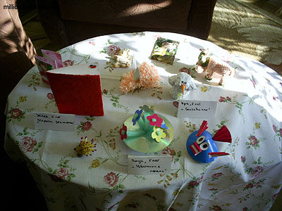 Размещаем поделки на столике и подписываем их