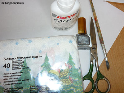 Для изготовления зимней поделки своими руками в технике декупаж вам потребуется лист белой бумаги, клей ПВА, лак для ногтей, салфетки с зимними мотивами.