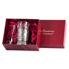 В набор входит: подстаканник, хрустальный стакан, ложечка в подарочном футляре. Цвет футляра на выбор: бордовый или голубой.