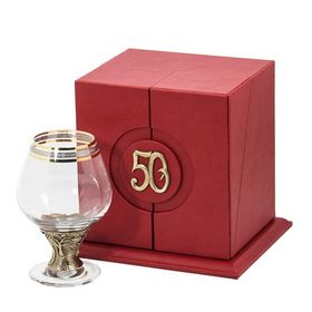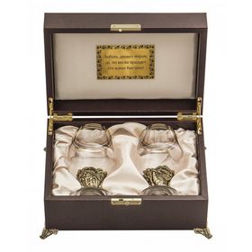 В набор с подстаканником входит хрустальный стакан с золотым ободком и подарочный картонный футляр.