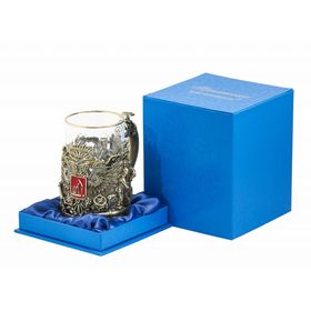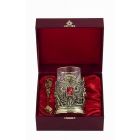 В подарочный комплект входит: подстаканник из бронзы, изготовленный методом точного художественного литья, фигурная ложечка из латуни, хрустальный стакан, подарочный кожаный футляр.