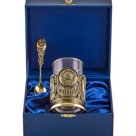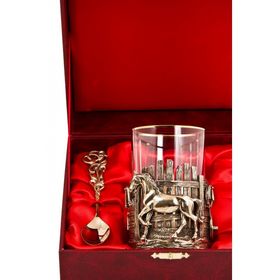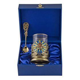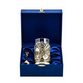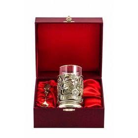 В подарочный комплект входит: подстаканник латунный точного художественного литья (ручная работа), стеклянный стакан, фигурная латунная ложечка, подарочный деревянный футляр.Цвет футляра может быть синего или бордового цвета, на Ваш выбор.