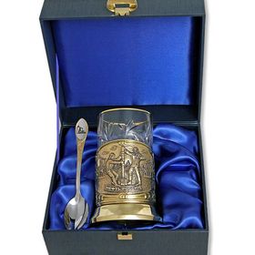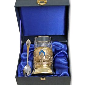 В подарочный набор для чая входит: подстаканник (латунь с позолотой), хрустальный стакан с золотым ободком, ложечка (нерж. сталь с гравировкой), подарочный деревянный футляр бордового или синего цвета, по Вашему желанию. Такой набор для чая станет оригинальным подарком для начальника...