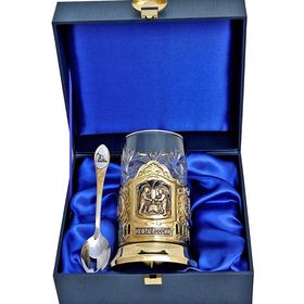 В подарочный комплект входит: латунный подстаканник с латунной накладкой точного художественного литья, хрустальный стакан с золотым ободком, подарочный деревянный футляр. Цвет футляра может быть синего или бордового цвета, на Ваш выбор.