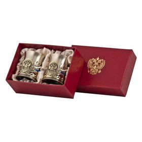 Набор из трёх стопок "Державных" изготовлен ; ;из латуни с позолочением и с трехколорными эмалями. ;Упакован в картонный футляр из дизайнерского картона с шелковым ложементом. Товара нет в наличии (К сожалению, магазин который раньше продавал этот товар сейчас его не продает)