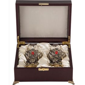 Материал: богемское стекло с золотым декорированием, бронза. Ручная работа. Размер бокала для бренди: Н- 160 мм, V - 400 мл.Размер ларца: 30*24*15 см. Сложное объемное литье из бронзы, в сочетании с декорированным богемским стеклом, делает эти бокалы не только презентабельными, но и функциональными...