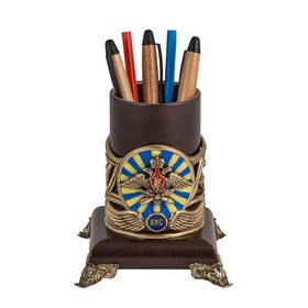 Стакан для письменных принадлежностей выполнен из кожи и оформлен подстаканником ручной работы из бронзы. Упакован в картонный футляр из дизайнерского картона с крышкой на магнитном клапане.