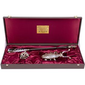 В набор для обуви "Фортуна" входят: рожок для обуви с деревянной ручкой, который помогает надевать обувь, крючок на стену для рожка "Колесо Фортуны" и жук-скарабей.Рожок для обуви с ;бронзовым навершием в виде фигурки ;древнеримской богини удачи ;и ручкой из дерева венге превратит процесс надевания обуви в целый ритуал, ведь держать его за деревянную ручку очень приятно, такой рожок радует глаз и привносит в интерьер элемент изысканности и благородства.С помощь бронзового ;настенного крючка можно прикрепить рожок к стене.Жук - скарабей – это не только украшение интерьера. Он призван помочь человеку снять обувь! Одной ногой наступаете жуку на спинку, второй – цепляетесь за усики, и вынимаете ногу из ботинка! В дореволюционной России подобное приспособление, так называемого денщика, можно было увидеть в каждом барском доме.Размер рожка для обуви: 460 × 45 × 35 мм.Размер крючка: 118 × 80 × 33 мм.Размер жука-скарабея: 280 × 145 × 60 мм.Размер футляра: 540 × 290 × 80 мм.