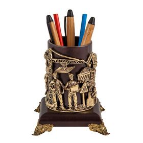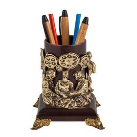 Стакан для письменных принадлежностей выполнен из кожи и оформлен подстаканником ручной работы из бронзы с цветными ювелирными эмалями. Упакован в картонный футляр из дизайнерского картона с крышкой на магнитном клапане. Ручки и карандаши в состав набора не входят.