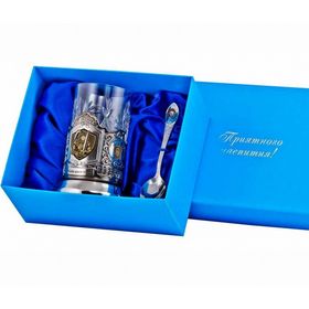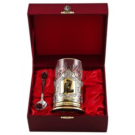 В подарочный набор для чая "Рыцарю моего сердца" входит: подстаканник (латунь с позолотой), хрустальный стакан с золотым ободком (250 мл), ложечка с гравировкой (нерж. сталь с нитрид- титановым покрытием). Набор упакован в подарочный деревянный футляр синего или красного цвета, на Ваш выбор.
