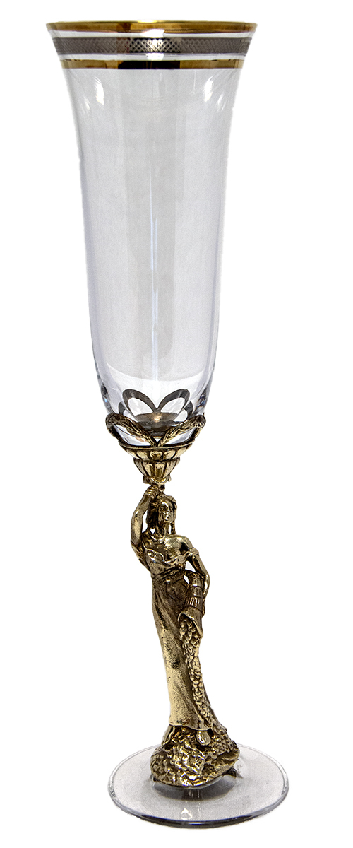 Материал: богемское стекло с золотым декорированием (отделка сеточка), бронза. Ручная работа.Размер бокала для шампанского: высота - 21,5 см, объем - 190 млРазмер футляра из дизайнерского картона: 33*14*9 см