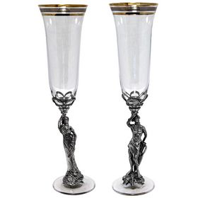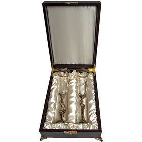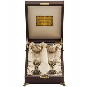 Материал: богемское стекло с золотым декорированием, бронза,футляр - кожа с бронзовой накладкой. Ручная работа.Размер бокала для шампанского: высота - 215 мм, объем - 190 мл.В набор входит 2 бокала: "55 лет" и "Виноградная лоза". Возможна комплектация 2 бокалами "55 лет" или 2 бокалами "Виноградная лоза".Также возможна индивидуализация текста на металлизированной золотой наклейке на внутренней крышке футляра.