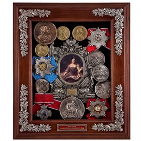 Эта настенная ключница из серии ключниц "История Российского Государства" выполнена вручную профессиональными российскими художниками и мастерами по традициям и технологиям, заложенным народными умельцами еще в XVII–XIX веках. Изящные композиции из медалей, орденов, знаков и монет, неповторимые орнаменты на бархатно-черном фоне, заключенные в багетные рамы из натурального дерева со стеклом, придают изделию особый, «аристократический» колорит, а историческое содержание создает ощущение причастности к чему-то важному. Сочетание функциональности, художественного мастерства и «коллекционности» делают эти ключницы поистине бесценным подарком, достойным лишь избранных – подлинных патриотов, знающих толк в произведениях искусства. Материал: медь с последующей декоративно-художественной обработкой, гальванопластика, никелирование, покрытие серебром, тонировка, патинирование, ювелирные цветные эмали, лазерная гравировка, бархат, натуральное дерево, латунная фурнитура, печать на холсте. Полные копии коллекций медалей, снятых в музеях Москвы, Санкт-Петербурга. Каждое изделие уникально.Размер: 34*30*9 см.