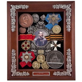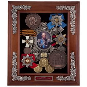 Эта настенная ключница из серии ключниц "История Российского Государства" выполнена вручную профессиональными российскими художниками и мастерами по традициям и технологиям, заложенным народными умельцами еще в XVII–XIX веках. Изящные композиции из медалей, орденов, знаков и монет, неповторимые орнаменты на бархатно-черном фоне, заключенные в багетные рамы из натурального дерева со стеклом, придают изделию особый, «аристократический» колорит, а историческое содержание создает ощущение причастности к чему-то важному. Сочетание функциональности, художественного мастерства и «коллекционности» делают эти ключницы поистине бесценным подарком, достойным лишь избранных – подлинных патриотов, знающих толк в произведениях искусства. Материал: медь с последующей декоративно-художественной обработкой, гальванопластика, никелирование, покрытие серебром, тонировка, патинирование, ювелирные цветные эмали, лазерная гравировка, бархат, натуральное дерево, латунная фурнитура, печать на холсте. Полные копии коллекций медалей, снятых в музеях Москвы, Санкт-Петербурга. Каждое изделие уникально.Размер: 34*30*9 см.