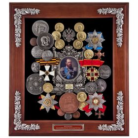 Эта настенная ключница из серии ключниц "История Российского Государства" выполнена вручную профессиональными российскими художниками и мастерами по традициям и технологиям, заложенным народными умельцами еще в XVII–XIX веках. Изящные композиции из медалей, орденов, знаков и монет, неповторимые орнаменты на бархатно-черном фоне, заключенные в багетные рамы из натурального дерева со стеклом, придают изделию особый, «аристократический» колорит, а историческое содержание создает ощущение причастности к чему-то важному. Сочетание функциональности, художественного мастерства и «коллекционности» делают эти ключницы поистине бесценным подарком, достойным лишь избранных – подлинных патриотов, знающих толк в произведениях искусства. Материал: медь с последующей декоративно-художественной обработкой, гальванопластика, никелирование, покрытие серебром, тонировка, патинирование, ювелирные цветные эмали, лазерная гравировка, бархат, натуральное дерево, латунная фурнитура, печать на холсте. Полные копии коллекций медалей, снятых в музеях Москвы, Санкт-Петербурга. Каждое изделие уникально.Размер: 34*30*9 см.