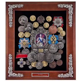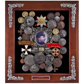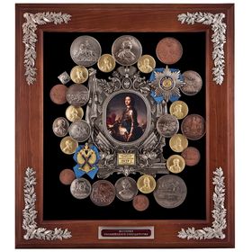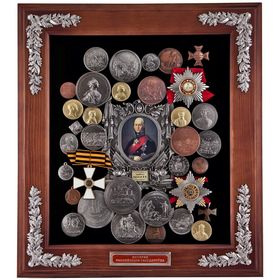 Эта настенная ключница из серии ключниц "История Российского Государства" выполнена вручную профессиональными российскими художниками и мастерами по традициям и технологиям, заложенным народными умельцами еще в XVII–XIX веках. Изящные композиции из медалей, орденов, знаков и монет, неповторимые орнаменты на бархатно-черном фоне, заключенные в багетные рамы из натурального дерева со стеклом, придают изделию особый, «аристократический» колорит, а историческое содержание создает ощущение причастности к чему-то важному. Сочетание функциональности, художественного мастерства и «коллекционности» делают эти ключницы поистине бесценным подарком, достойным лишь избранных – подлинных патриотов, знающих толк в произведениях искусства. Материал: медь с последующей декоративно-художественной обработкой, гальванопластика, никелирование, покрытие серебром, тонировка, патинирование, ювелирные цветные эмали, лазерная гравировка, бархат, натуральное дерево, латунная фурнитура, печать на холсте. Полные копии коллекций медалей, снятых в музеях Москвы, Санкт-Петербурга. Каждое изделие уникально.Размер: 50*45*10 см.
