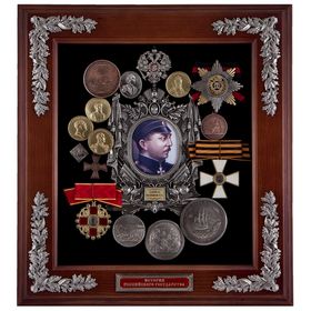 Эта настенная ключница из серии ключниц "История Российского Государства" выполнена вручную профессиональными российскими художниками и мастерами по традициям и технологиям, заложенным народными умельцами еще в XVII–XIX веках. Изящные композиции из медалей, орденов, знаков и монет, неповторимые орнаменты на бархатно-черном фоне, заключенные в багетные рамы из натурального дерева со стеклом, придают изделию особый, «аристократический» колорит, а историческое содержание создает ощущение причастности к чему-то важному. Сочетание функциональности, художественного мастерства и «коллекционности» делают эти ключницы поистине бесценным подарком, достойным лишь избранных – подлинных патриотов, знающих толк в произведениях искусства. Материал: медь с последующей декоративно-художественной обработкой, гальванопластика, никелирование, покрытие серебром, тонировка, патинирование, ювелирные цветные эмали, лазерная гравировка, бархат, натуральное дерево, латунная фурнитура, печать на холсте. Полные копии коллекций медалей, снятых в музеях Москвы, Санкт-Петербурга. Каждое изделие уникально.Размер: 50*45*10 см.