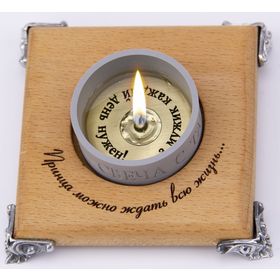 Свеча с секретом. Иногда ожидание так же сладко, как и само сообщение.Когда воск свечи тает, на дне подсвечника медленно раскрывается тайное послание.Появление надписи примерно через 20 мин.Полностью надпись открывается примерно через 30 мин.Общее время горения свечи около 2-х часов. Когда тайна разгадана, подсвечник можно использовать под стандартные чайные свечи, а первую сохранить на память.В помощь дарителю, свеча комплектуется подсказкой — картонным диском, нанизанным на фитиль. На нем надпись тайного послания под слоем парафина. Не забудьте убрать подсказку в момент дарения. По вашему заказу нанесём любые надписи на подсвечник и на дно чаши свечи.Услуга бесплатна, срок исполнения — один рабочий день.Желаемые надписи можно написать при оформлении в комментариях к заказу. Деревянный подсвечник из бука имеет гладкую поверхность. Для создания грязеотталкивающих свойств и сохранения уникальных свойств дерева – запаха, уюта и тепла, подсвечник покрыт натуральным маслом. Лазерная гравировка текста.Ножки изготовлены методом точного художественного литья из сплава цветных металлов МНЦ-15-20 нейзильбера ("новое серебро") — среднее между серебром и мельхиором.Размер подсвечника: 8*8*1,5 см.Чаша подсвечника — акрил с надписью «Тайное послание».Размер чаши: диаметр 3,5 см, высота 1,8 см.Парафин — очищенный, с натуральным экстрактом зеленого чая.Фитиль — из натурального хлопка, что делает пламя свечи чистым и ровным.Шильд на дне свечи — металл с гравировкой текста послания.Подарочная коробка- бонбоньерка.Размер коробки: 8*8*9 см.Надписи на коробке:«Эмоции в подарок...»«Когда мы начинаем окружать себя красивыми вещами и добрыми мыслями, то жизнь начинает меняться в лучшую сторону...»«Даже самый маленький подарок становится великим даром, если ты вручаешь его с любовью...»«Главные вещи в нашей жизни - не вещи...»