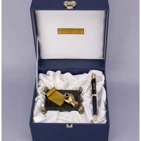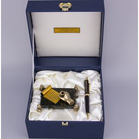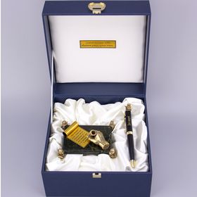 Корпус ручки черного цвета выполнен из сплава латуни. На корпус методом глубокой гравировки нанесены объемные буквы мотивирующего текста: Для высших резолюций Для важных слов Для гениальных мыслейНавершие «Лев» из латуни, выполненное в уникальной технике точного художественного литья, является главной изюминкой ручки. Модель сделана вручную мастерами ювелирного дела. На изготовление каждого изделия уходит несколько дней кропотливого ручного труда. Каждая фигурка уникальна и неповторима.Вес- 44 гр., размер- 16*1,3 см.Пишущий узел металлический. Универсальный. Бренд Parker. Легко меняется. Диаметр шарика стержня — 0,9 мм. Мягкая паста синего цвета обеспечивает чистую линию письма и позволяет создать до 600 страниц рукописного текста. Механизм подачи стержня — поворотный, высокоточный. Клип-зажим золотого цвета для крепления к блокноту, папке, карману.Держатель для ручки из бронзы стилизован под кисть руки с пером, которая выводит на свитке текст:Как только у вас появиласьхорошая мысль, запишите её —это первый шаг к её претворению в жизнь… Кисть руки с пером — бронза;Подставка — натуральный камень Серпентинит (Змеевик), добытый на Чебаркульском месторождении Урала; цвет подставки может отличаться от представленных на фото, т.к цвет и структура в разных местах добычи разная. Эта особенность натуральных камней указывает на природное, а не искусственное происхождение. Нет ни одного похожего камня. Это значительно повышает ценность подарка.Ножки подставки из бронзы в виде совы на книгах;Свиток из металлизированного пластика с лазерной гравировкой текста;Размер подставки — 11*7,5 см.Подарочный футляр из МДФ, обтянут дизайнерской бумагой синего цвета, с ложементом из шелка. Замок латунный, «Автомат».Металлизированный шильд золотого цвета на обратной стороне крышки с текстом:Осанка, благородство и порода!По-королевски щедр, мудр и прозорлив!Вы точно, сударь, царственного рода!Не спорьте, всё об этом говорит!Размер футляра — 21*21*13 см Персонализация: заказать свой текст, пожелание, имя, логотип или признание можно на металлизированном шильде на внутренней стороне крышки футляра, на корпусе ручки методом лазерной гравировки и на крышке футляра методом цветной УФ-печати. Стоимость данной услуги рассчитывается в зависимости от объема работ.