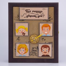 В состав набора включены магниты из акрила:стрелка — 1 шт.таблички с названиями домашних дел — 9 штук:Чья очередь мыть посуду?Чья очередь убирать дом?Чья очередь гулять с собакой?Чья очередь готовить завтракообедоужин?Чья очередь зависать в соцсетях?Чья очередь вести машину из гостей?Чья очередь лежать на диване и ничего не делать?Чья очередь идти в кинотеатровечеринку?И вообще, кто в доме хозяин?таблички с изображением членов семьи разного возраста — 8 штук:Дедушка;Бабушка;Папа (дядя, сват, свёкр, тесть); Мама (тетя, сватья, свекровь, теща);Дочь старшая (сестра, золовка, невестка, сноха); Сын старший (брат, зять, свояк, шурин, деверь);Дочь младшая (сестричка, внучка, племянница); Сын младший (братик, внук, племянник).Таблички надежно крепятся на металлическом листе панно. В зависимости от состава вашей семьи, выбирайте необходимые таблички, актуальные дела и передвигайте стрелку на дежурного в этот день. Тексты и изображения на прозрачных акриловых магнитах легко меняются. Дела вы можете придумать сами, написать и вставить в большую табличку, а вместо мультяшных картинок вставьте фото членов вашей семьи.Погрузившись в эту игру-мотиватор по креативному распределению домашних обязанностей, вы скоро увидите, как сплотилась ваша семья, сколько свободного времени осталось на отдых, увлечения и общение друг с другом. Для этого предусмотрительно в набор включены таблички с вариантами приятного времяпровождения.Размер магнитов для членов семьи: 6,5*6,5 см.Размер магнитов для домашних дел: 13,3*6 см.Размер панно: 37*37*1,5 см. Багет выполнен из дуба.Размер подарочной коробки из крафт-картона: 41*41*6 см.