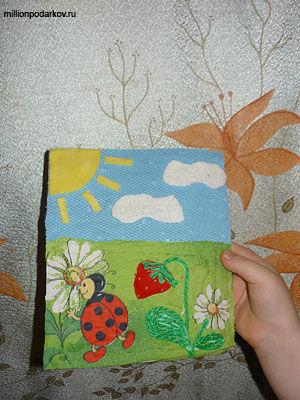 Приклеиваем солнышко, облачка, ягодку. Делаем из ниток стебелек, листики и чашелистик у ягодки.