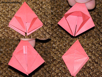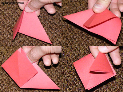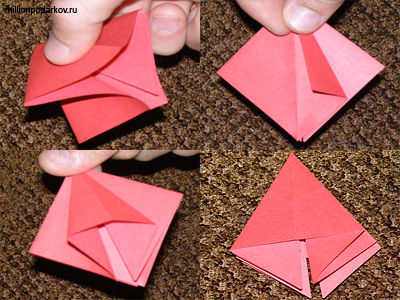 После того как сделаны загибы углов к средней линии, мы раскрываем каждый из получившихся треугольников как показано на фото.
