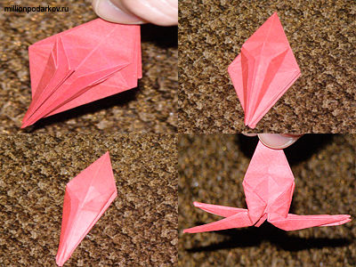Теперь делаем загиб нижнего треугольника двойной заги, что б получились тоненькие ножки нашего "Морского краба". После отгибаем их, что б он мог стоять как показано на фото.