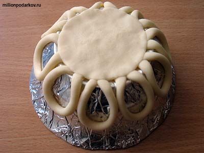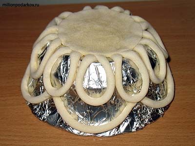 Раскатаем тесто в колбаску, нужной ширины и толщины, и выложим кольцами по окружности пиалы. Сверху прилепить лепешку, образующее дно корзинки.