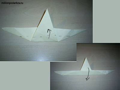 Руководствуясь нижеприведенными фотографиями, делаем две складки (первая вверх, а вторая вниз).