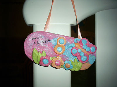 Теперь пишем маркером пожелание маме и покрываем изделие лаком. Осталось лишь с обратной стороны приклеить скотчем отрезок атласной ленты. Вот и готов замечательный сувенир для мамы к празднику.