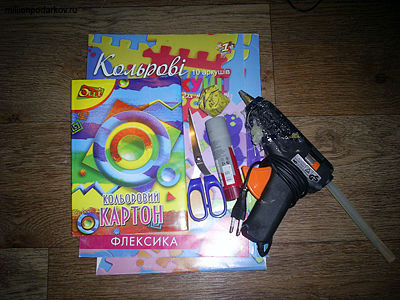 Для того чтобы сделать открытку с конфеткой, мы использовали такие материалы, как цветной картон, набор флексики, ножницы, клей сухой пальчиковый, клеящий термопистолет.