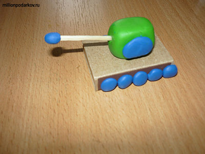 Вставляем спичку в пластилиновый кубик, на спичку лепим горошинку из пластилина - это будет дуло и прицел. Детская поделка к 9 мая "Танк" готова!