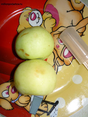 Для домашнего творчества поделки из овощей и фруктов приготовьте, яблоки и огурцы. Так же вам потребуются зубочистки, нож и разделочная доска.