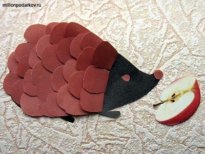 Из коричневой бумаги вырезать иголки полукруглой формы. Так как иголок понадобиться много, лист бумаги можно сложить сразу в 4-6 слоев и вырезать. "Иголочку" согнуть на2-3 мм у основы и приклеивать к ежику как показано на фото.