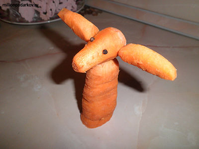 Фруктово – овощные поделки привлекают не только внимание детей, но и взрослых. Нам понадобятся две моркови, а также семечки яблок. Не забудем приготовить и зубочистки