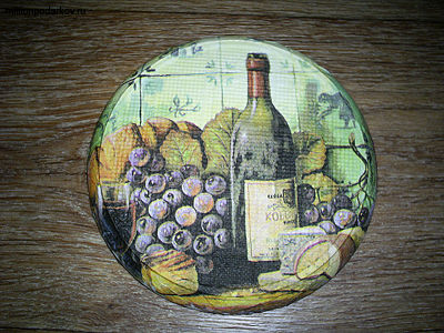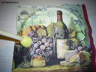 Вырезаем из салфетки нужный мотив, отделяем верхний красочный слой и приклеиваем клеем ПВА его к тарелке. Клей следует предварительно наносить на поверхность мисочки. Приглаживаем салфетку кусочком паралона.