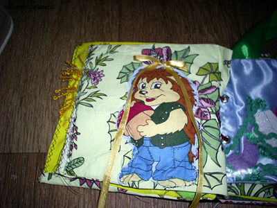 Хочу привести в качестве примера самодельной развивающей игрушки книжку, сделанную собственноручно. Этой книжкой можно играться с трех месяцев. Все страницы шились из квадратов ткани, которые соединялись с трех сторон, выворачивались наизнанку. Затем вставлялся картон, и сшивалась третья сторона. Вот первая страничка. Здесь пришита вырезка из ткани детской расцветки и ленточка, завязанная бантиком. Под вырезкой находятся кусочки плотной фольги. Поэтому если ее потрогать, то будет ощущаться шуршание.