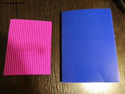 Лист неонового картона складываем пополам, разрезаем и складываем еще раз вдвое. Из гофрированного картона вырезаем деталь и приклеиваем сверху заготовки.