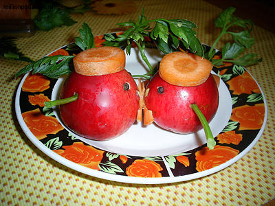 Из яблок делаем влюбленную парочку. Для этого нам понадобится петрушка, две косточки лимона, морковка и перец горошком. Из петрушки делаем ручки и вставляем их в яблоко. Отрезаем два кружечка морковки и делаем из них шапочки. Вставляем нос – косточку, глаза – перец. Из половинки кружечка морковки вырезаем ротик. Прикрепляем его к яблоку с помощью зубочистки. В итоге у нас получаются два забавных человечка.